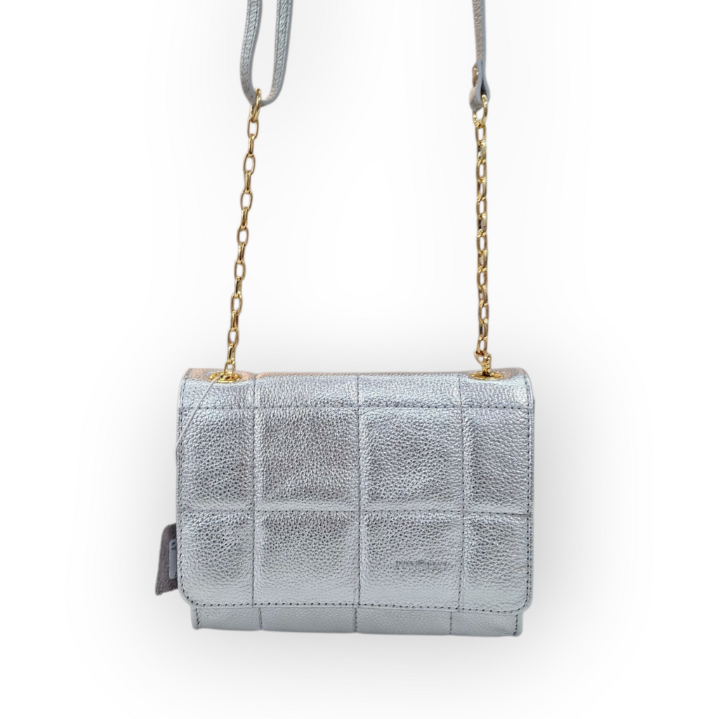 BOLSA TIRACOLO VICENZA PRATA, ESTILO MODERNO COM ACABAMENTO METALIZADO, DESIGN ACOLCHOADO E ALÇA AJUSTÁVEL. COMPACTA, PRÁTICA E CHEIA DE CHARME.